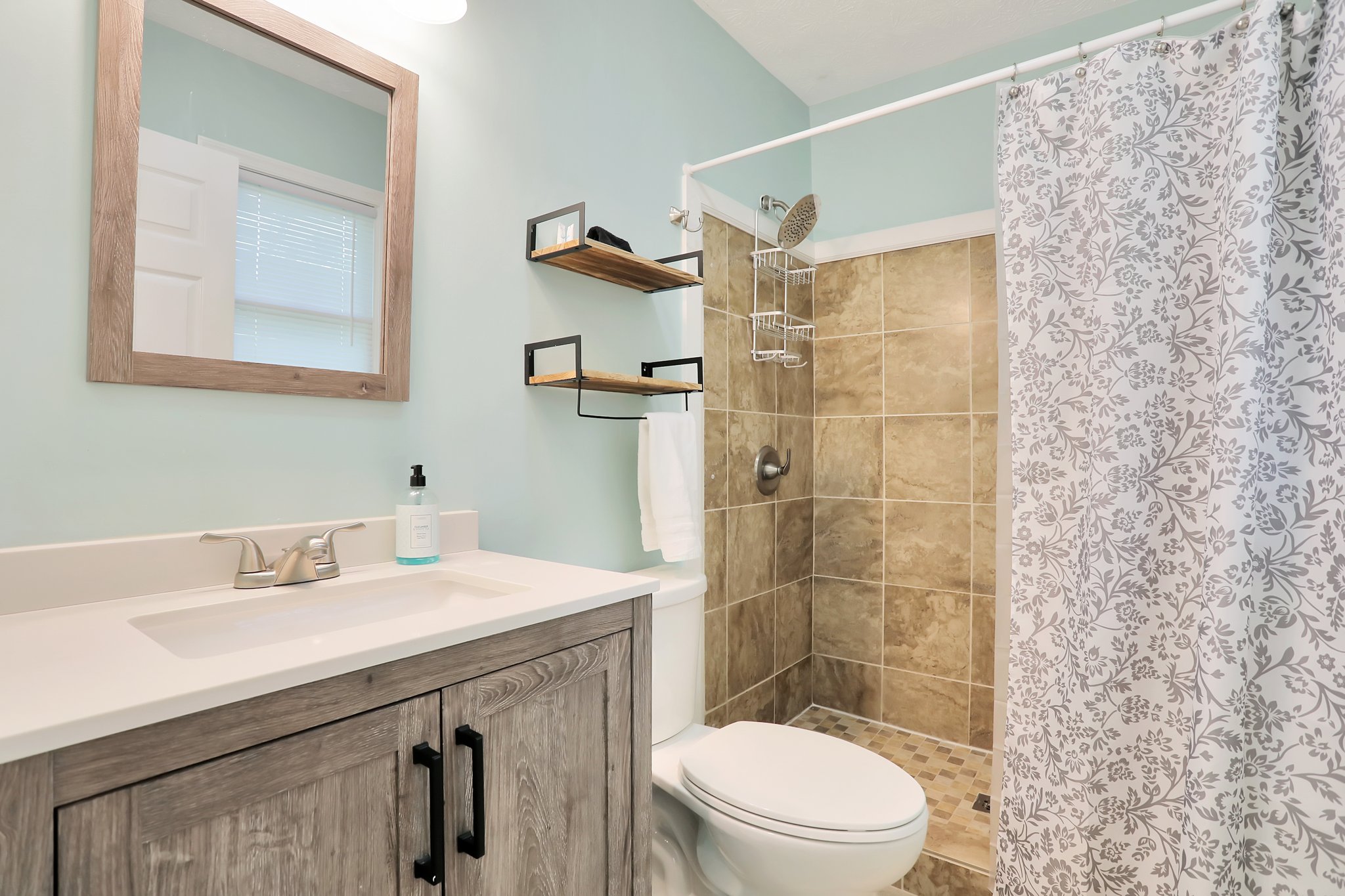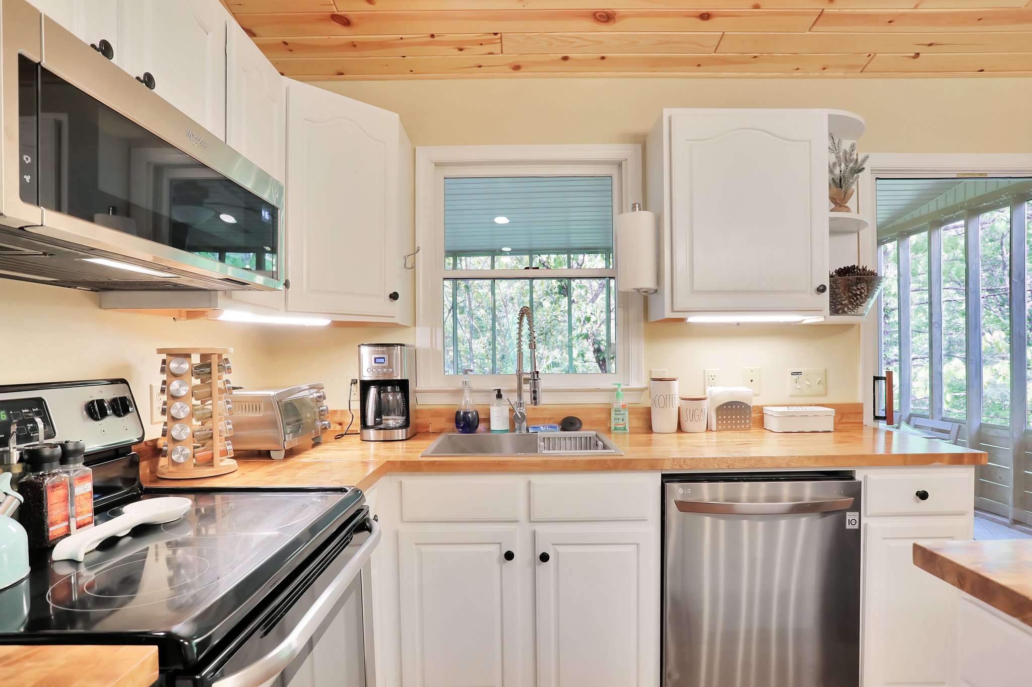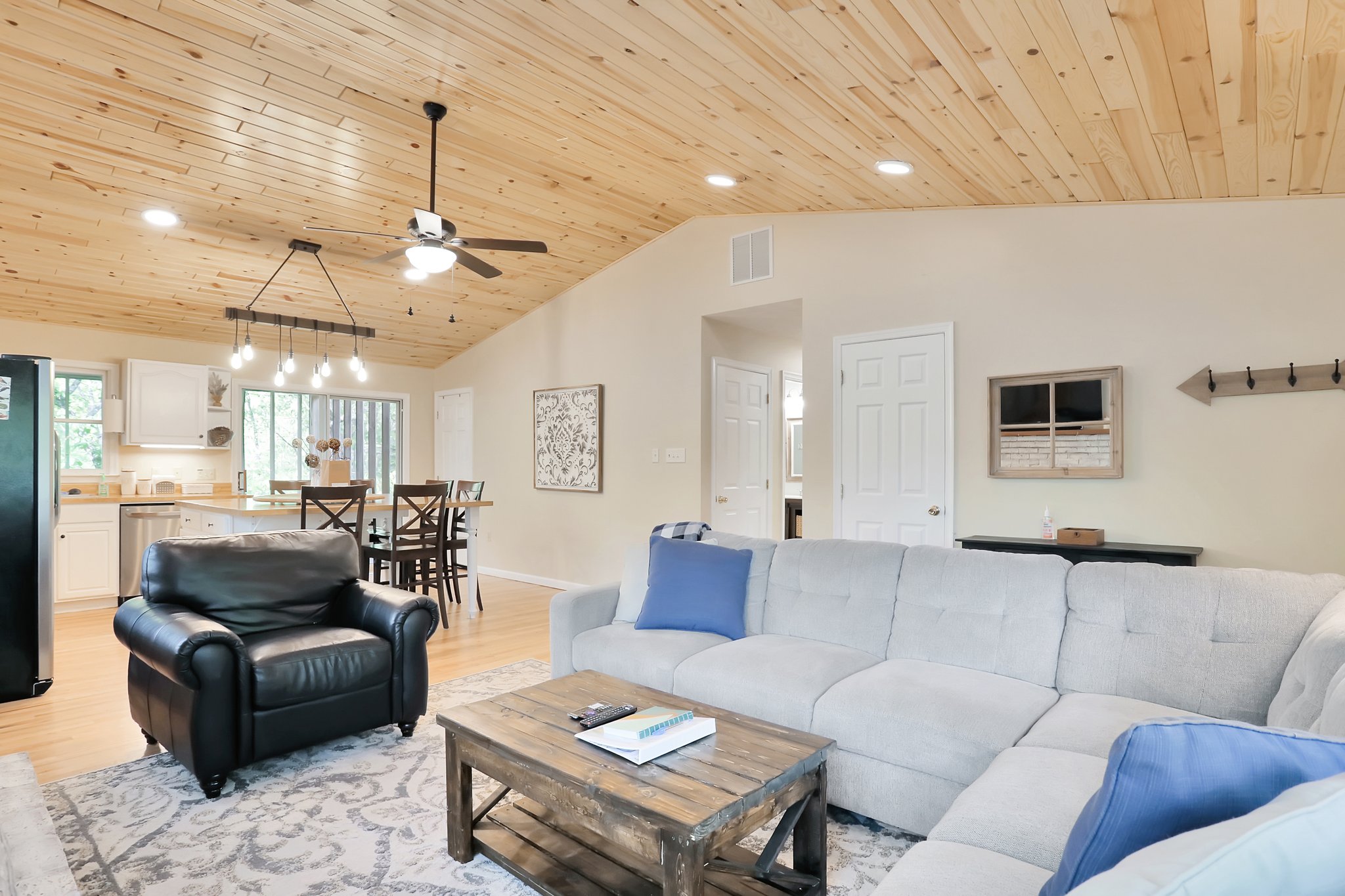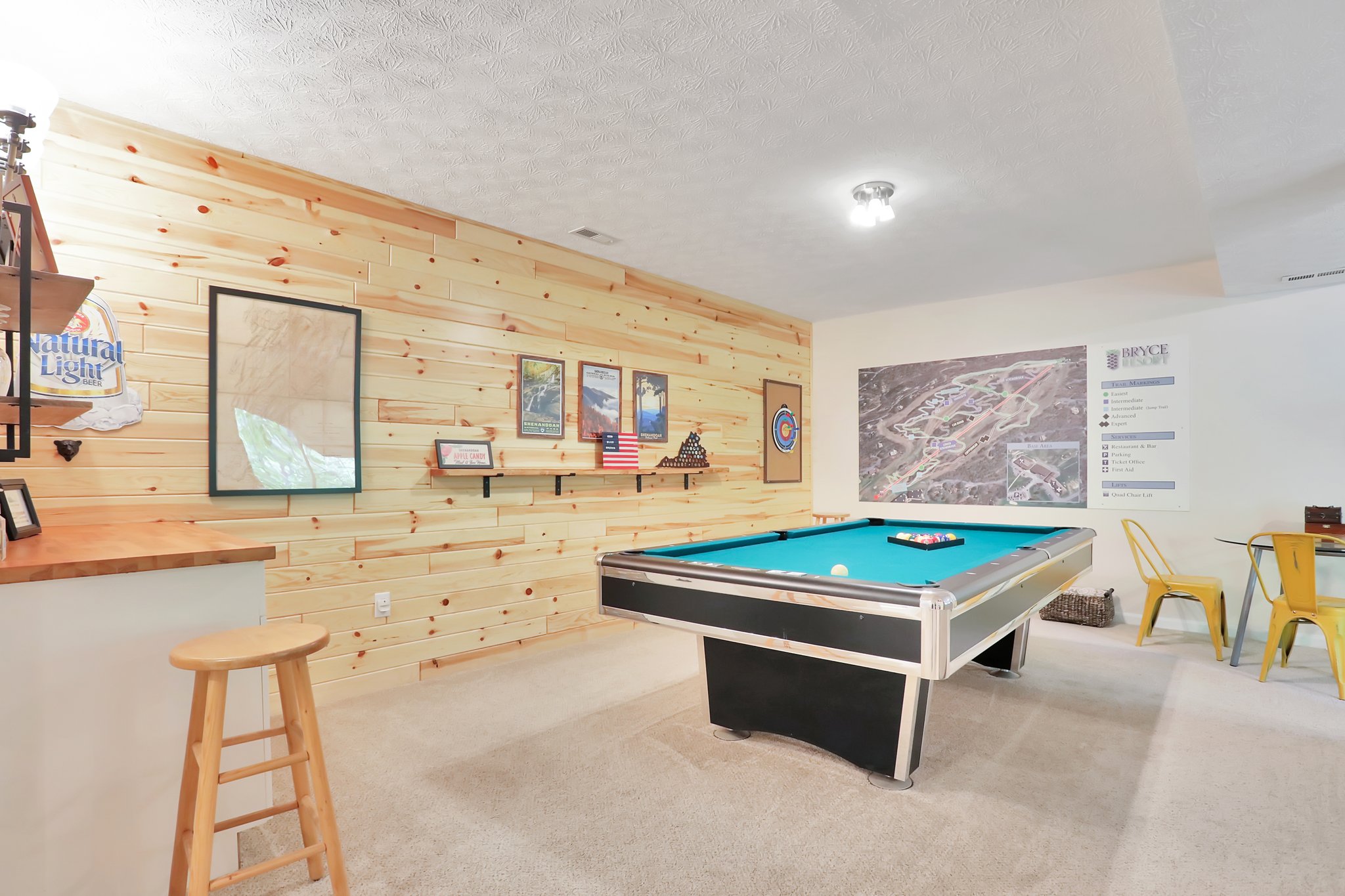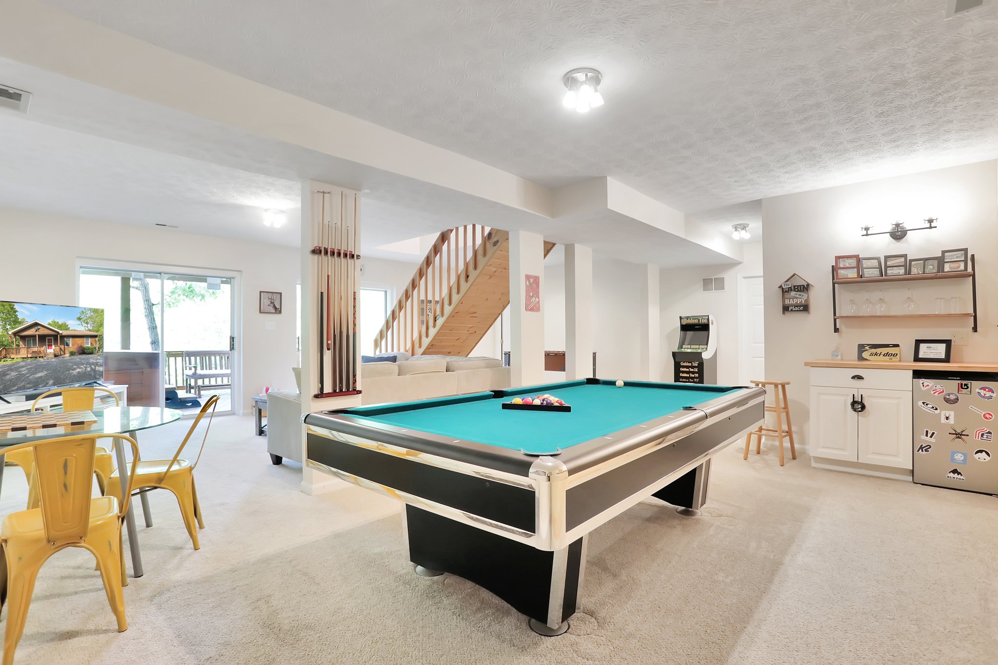 Welcome to Lazy Basye! This cabin is ideal for families, groups and couples with enough space for 10 people to sleep comfortably in beds and also plenty of space to hang out without being on top of each other! Two full indoor living areas, 3 full baths, great outdoor spaces including screened deck, covered hot tub, fire pit, and other deck, and fully equipped kitchen with huge island steps from Bryce Resort! Top to bottom renovation in 2020. Large sectional & TV over the fireplace on the main level and large rec room in lower level. Beautifully updated and appointed - all the amenities of home + more. Well equipped kitchen (filtered water, ice, coffee & tea, SS appliances, lots of dishes, pots and pans, kitchen gadgets - ninja blender, crock pot, coffee maker, hand mixer etc), 4 smart HDTVs, super fast internet, 2020memory foam mattresses (2 king, 1 Queen, and 2 Bunks (4 twins)), black out curtains and ceiling fans in all bedrooms, electric fire place and fire pit with free firewood, large hot tub that is serviced weekly, tons of useable outdoor space, lots of space and fun in the Rec room- pool table, Golden Tee golf arcade game, old school Nintendo, foosball table, lots of games and books. Side deck with gas grill and table seating, screened porch is additional living room with TV, sectional couch and expandable dining table. Linens provided (sheets, towels, beach towels for hot tub and lake, extra pillows and lots of blankets). Full size washer/dryer. Two minute drive to the resort! A few days worth of starter supplies are provided (paper towels, toilet paper, trash bags); you may need to bring extra for longer stays. Laundry and dish detergent, shampoo and conditioner, and body wash and soap are provided. Full size portable crib and a pack n play and a high chair are at the house for your use. The home will be decorated for the holidays from November - early January. This is a two level house. The main level has the kitchen, living room with electric fireplace, 3 bedrooms (1 king, 1 queen and 1 bunk room with two bunks), and two full baths (one en suite to the king room and one hall bath). The screened-in porch and side deck with gas grill are on this level. The lower level is a full daylight/ walk out basement and has 1 bedroom (king), full bath, rec room with sectional, 65” TV, pool table and foosball table, and laundry room. There is a deck with the hot tub on this level. The fire pit can be accessed by a path from this deck or from steps off the driveway. Parking/driveway is in the front of the house on main level.